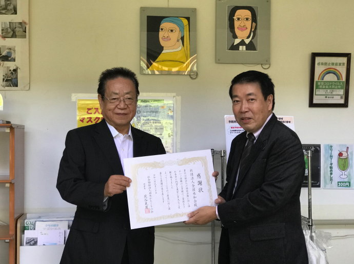 理事長の炭谷様と面談をし施設に通われている皆さんのコロナ禍の状況など会話が進み次回施設でイベントなどがあるときはマジックショーや歌など何か協力させてもらう話をし当会の新春の集いなどで募りました浄財を寄付させて頂きました。